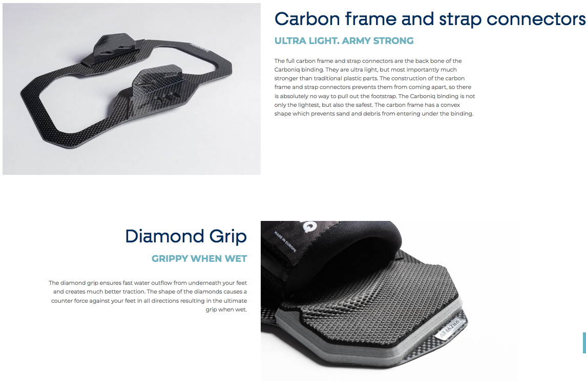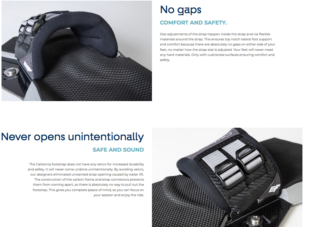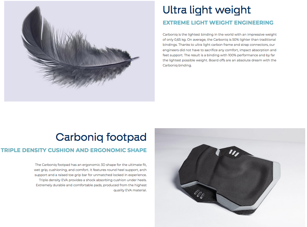 It is the lightest binding in the world with an impressive weight of only 0,65 kg and absolutely zero compromise to cushioning, comfort, impact absorption and feet support. The footpad base and footstrap connectors are made from ultra light and strong carbon fiber. The pad base is topped with an ergonomic triple density EVA footpad and non slip diamond grip. The Carboniq strap features a four point attachment to the pad for the best rider to board connection and a true locked in feel. Size adjustments of the strap happen inside the strap and via flexible materials around the strap. This ensures top notch lateral foot support and comfort because there are absolutely no gaps on either side of your feet, no matter how the strap size is adjusted. The strap size adjustments can easily be made on the go. The Carboniq footstrap does not have any Velcro for increased durability and safety. It will never come undone unintentionally. Inside the strap, our designers created a T split allowing the strap to flex in multiple directions and also bend vertically for the best possible fit.
